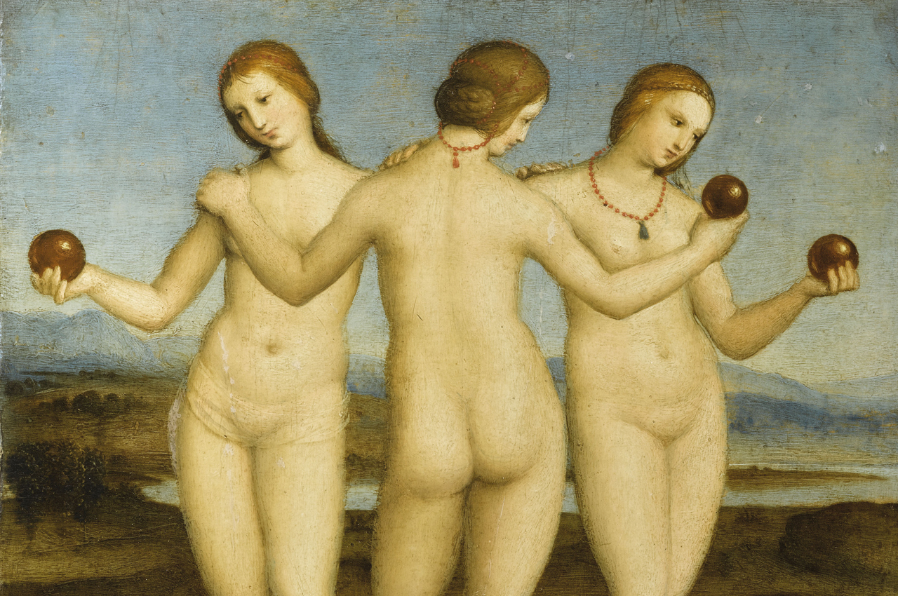 Only by a direct comparison with the image of the Graces painted by Raphael, it can be seen that the modifications in the Jaquotot are pondered, ingenious, of significant symbolic relevance. Immediately it is noticeable how the arid place has turned into a mild environment where Aglaia, Euphrosyne and Thalia, in perfect feminine beauty are preparing, with one hand on the shoulder of the other, to dance. Each one holds in her hand the fruit with the magical golden colour, that attracts their gaze. The prodigious gift, that Venus has meant to those who deserve it, and that is offered by his aides.