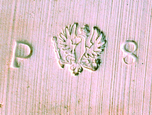 The porcelain plate measures 23.2 cm in width and 21.5 cm in height. On the glazed surface the motif is not centrally painted, and measures 17.5 cm x 20 cm. On the back, positioned between the letter “P” and the digit “8” (8 ounces) is the crowned eagle with sceptre and the sphere in the […]